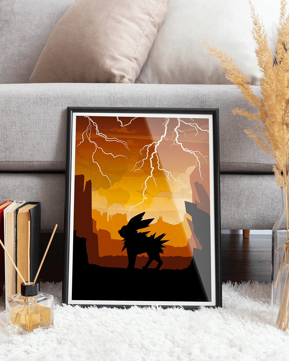 Affiche Voltali Pokémon au style vitrail et électrique. Une création originale Des Sources Print, parfaite pour les fans de Pokémon et la déco murale. Laissez-vous électriser par Voltali, l’évolution de type électrique d’Évoli, sublimé dans une illustration vitrail minimaliste signée Des Sources Print. Cette affiche Pokémon Voltali capte toute la vitalité et la tension lumineuse du tonnerre, dans un dégradé de jaunes et de blancs éclatants, contrasté par la silhouette sombre du Pokémon.